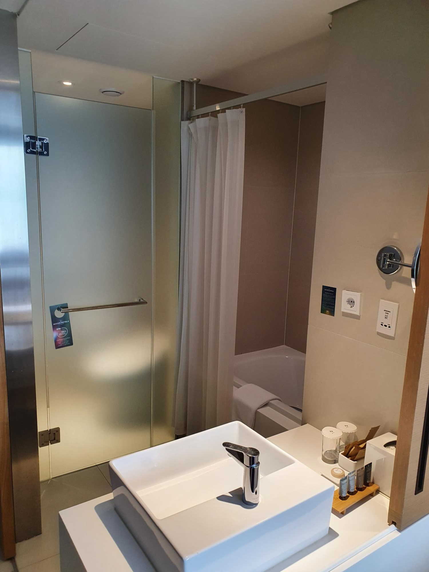 단정한 세면대와 어메니티들이 있습니다. 당연히 치약이나 칫솔은 따로 준비하셔야하고 욕조는 다리는 쭉 펼 정도는 안되지만 만족스럽게 사용할 수 있었습니다. 최근 코로나 사태 때문에 출입 시 발열체크를 하고 있고 각종 운동시설은 현재 사용할 수 없는 상태이니 확인하시고 예약하세요.