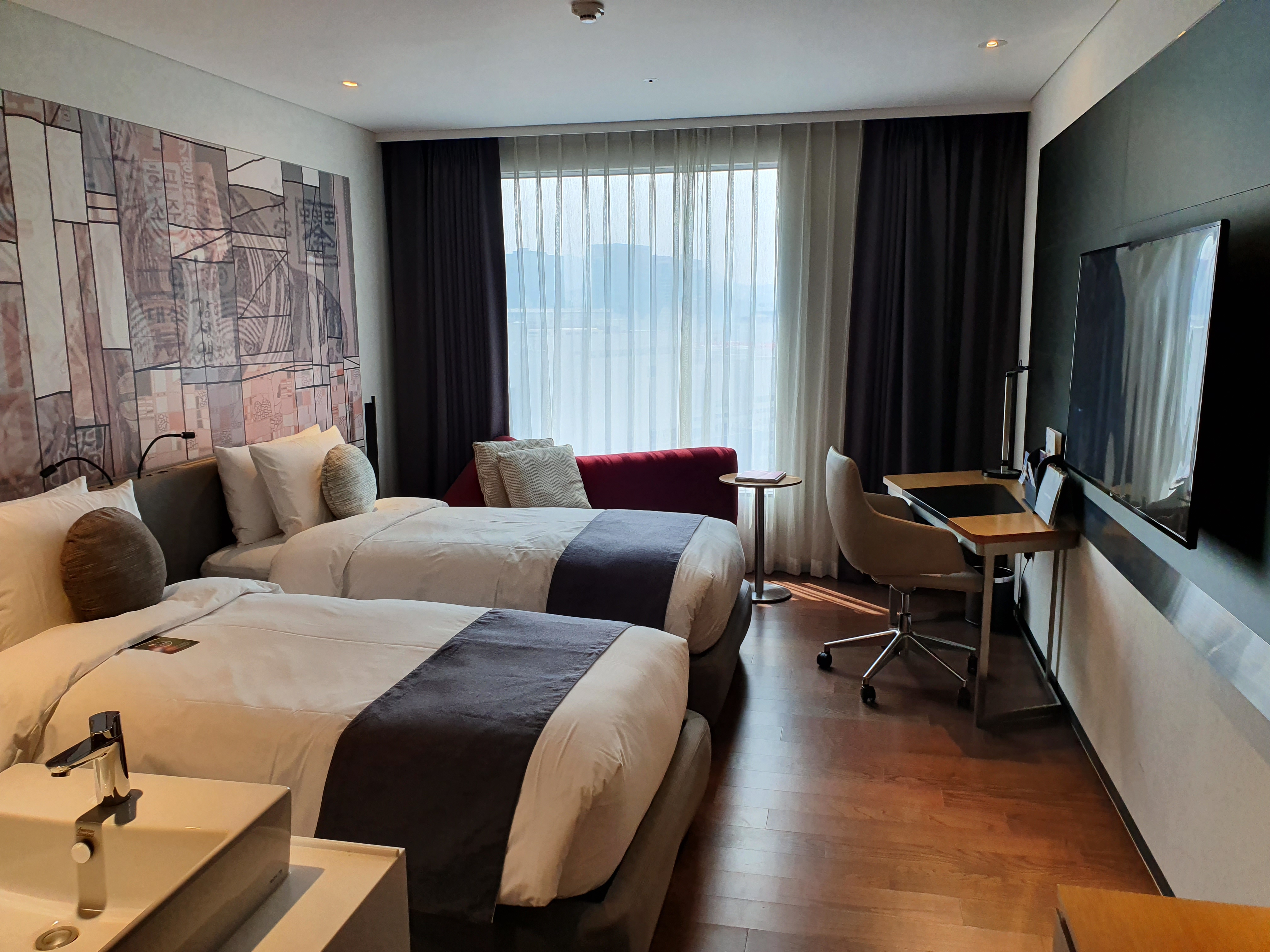 싱글침대 2개와 TV, 테이블, 작은 소파로 구성되어있습니다. 아이가 있어서 따로 욕조가 있는 방으로 배정을 해주셨고요. 분리된 화장실과 세면대로 나뉘어있습니다. 방은 작은 편이지만 숙소에서 생활한 건 아니기에 괜찮았습니다. 다만 싱글 침대는 그야말로 싱글 침대라 아이와 함께 자기에도 빠듯한 정도입니다. 아이가 있다면 차라리 큰 침대 하나짜리로 배정을 받으시는 게 나을 거 같습니다. 아니면 간이침대를 따로 요청하거나요.